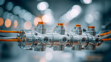 A sleek setup of metallic valves linked by vibrant blue tubes, signifying precise regulation of compressed air within automated industrial machinery.