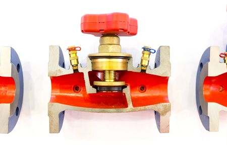 Red valves on hydrant pipelines of security and fire extinguishing systems of modern chemical production with copy space.