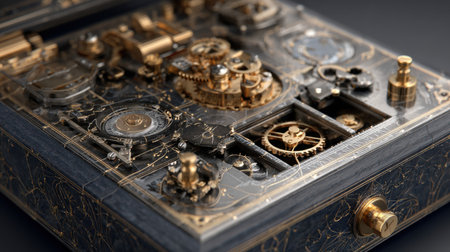 Close-up reveal of an elaborate clockwork mechanism featuring finely crafted gears and gold detailing, exhibiting superb engineering and design.