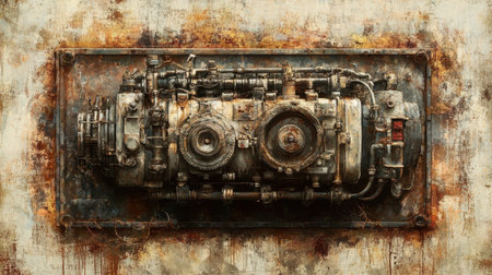 Close-up view of a textured rusty engine mounted on a wall, highlighting intricate mechanical details that evoke an industrial atmosphere.