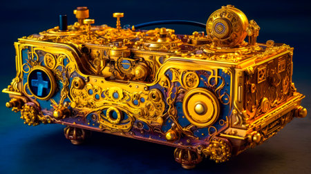 Gold and blue steam engine on blue surface with black background. Generative AI.