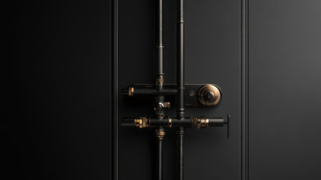 A visually striking arrangement of black pipes and valves against a vibrant red wall, showcasing industrial design elements suitable for engineering and construction projects.