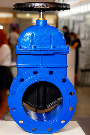 Closing valve on water pump station is pipeline with tanks in an technical room for supply of high-pressure aqua. Water sprinkler pipes and pressure control industrial system. Copy text space