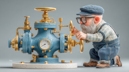 A whimsical elderly man inspects a vintage water valve with curiosity. The charming character features detailed craftsmanship, showcasing a unique blend of art and engineering.