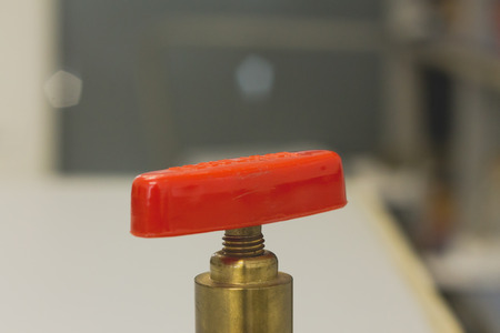 Close-up photo of a red valve against a beige wall of a nuclear icebreaker.