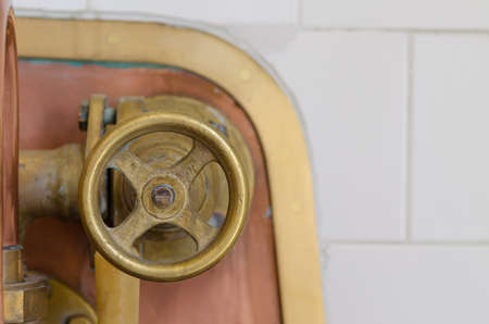 Close-up of industrial pair of valves with focus on foreground ventil with copy space.