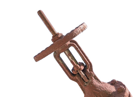 This image features a close-up of a rusty industrial valve with an orange handle. The weathered metal surface displays textures of wear and corrosion, evoking a sense of history and industrial heritage.