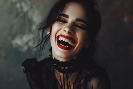Close-up of a seductive vampire with red lips and blood dripping down her chin, against a dark and mysterious backdrop