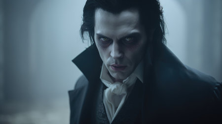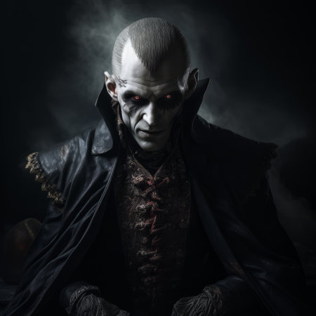 a captivating fan art photograph of dracula from the bbc series vampire maniacs by david giatrossi. this tabletop photography piece showcases the dark fantasy creature with soft lighting, highlighting the intricate details. shot using a sony fe 85mm f/1.4 gm lens, the portrait captures the essence of the changelingcore and frostpunk aesthetics, creating a beautifully sculpted image. ai generated
