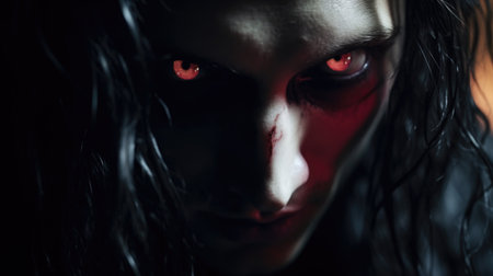 Elegant vampire costume portrait of a woman with a gothic look, ideal for Halloween promotions or advertisements. Dark, muted color palette with emphasis on black and red contrasts