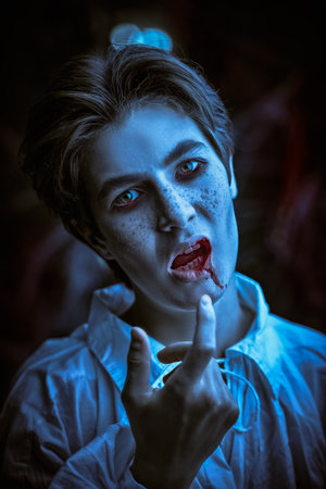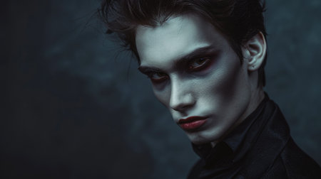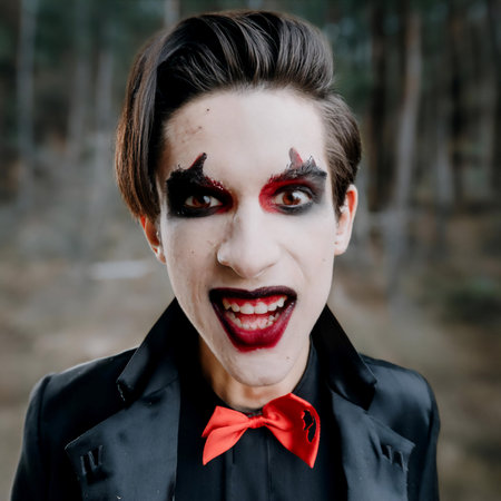 Close-up portrait of a young man in a black shirt with a vampire makeup