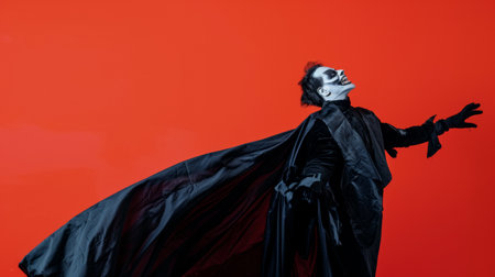 A person dressed as a vampire with white face paint and a black cape stands against a bright red background.