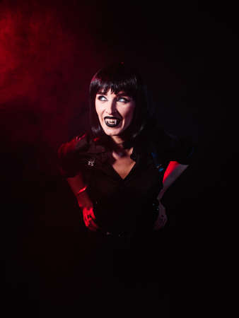 Vampires. Portrait of a beautiful vampire lady with drops of blood on her lips, standing in a low-cut black dress in a dark room. Halloween. Place for text.