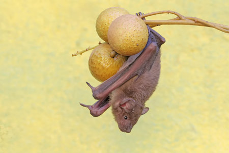 A short-nosed fruit bat eating longan fruit. This flying mammal has the scientific name Cynopterus minutus.