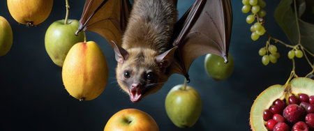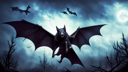 Close-up of a bat flying at night, mysterious forest background. Nocturnal wildlife and nature concept