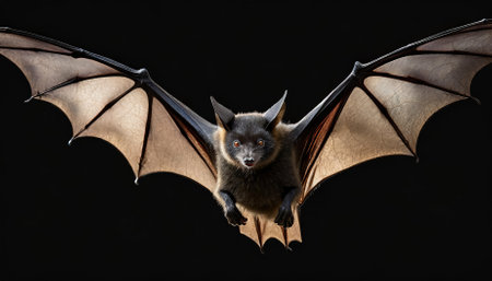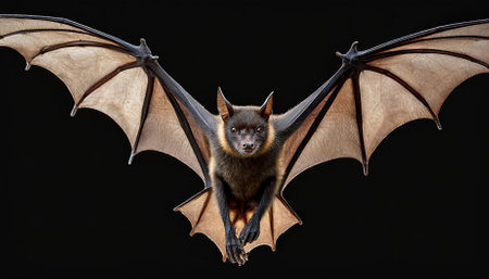 Bat with spread wings in mid-flight against dark background