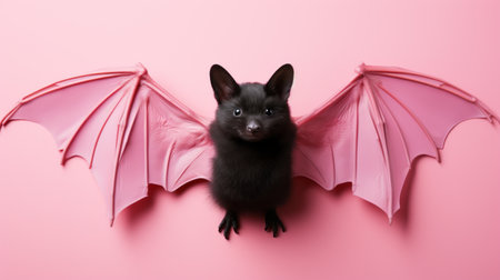 small white bat with pink wings flying on a pink background, showcasing detailed attention to costume and fashion. the dark black and dark amber hues add a touch of gothic influence. this cute and colorful image captures the essence of artists caras ionut and rinko kawauchi's style. ai generated