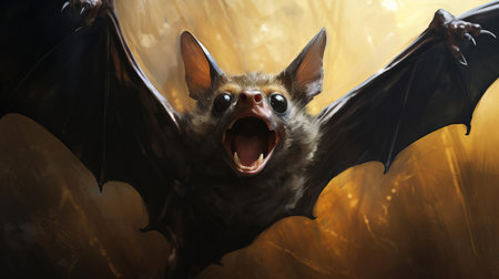 a flying bat with wings out of its nest, soaring into the dark. this captivating photograph by dimitry roulland showcases a mysterious jungle setting. the bat's characterful portrait is captured in close-up, highlighting its dignified pose. the vibrant colors of light red and yellow add to the allure of this unique animal portrait made of rubber. ai generated