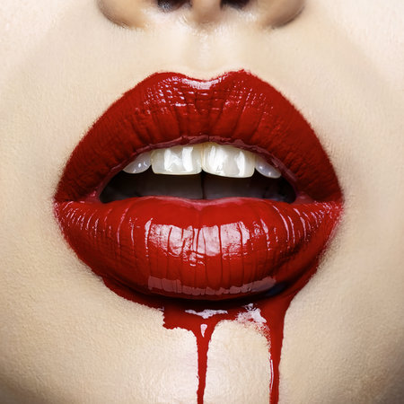 Vivid close-up of red glossy lips with dripping lipstick, highlighting beauty and makeup artistry for fashion shoots or editorial projects.