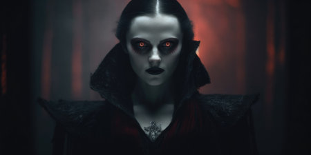 Mesmerizing gaze of a formidable vampire queen captures your attention. Concept Vampire Queen, Mesmerizing Gaze, Formidable Presence, Captivating Eyes