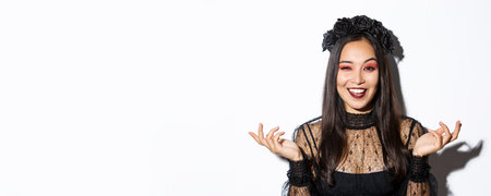 Close-up of sassy pretty asian woman in wicked witch costume making evil laugh and spread hands sideways, standing over white background