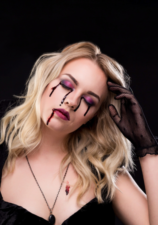 Beautiful blonde girl vampire with closed eyes. The blood is on the mouth and eyes.