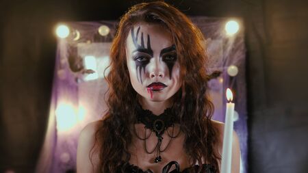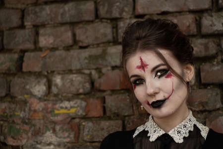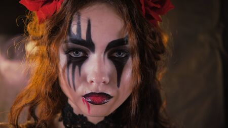 Closeup photo shoot of spooky girl with evil clown makeup at dark photo studio.