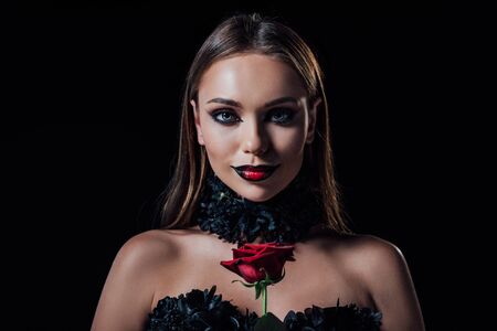 smiling scary vampire girl in black gothic dress holding red rose isolated on black