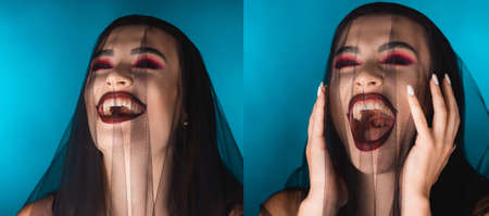 collage of evil bride with dark makeup and veil laughing on blue
