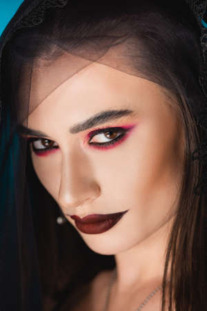 woman with black makeup and veil looking at camera on blue