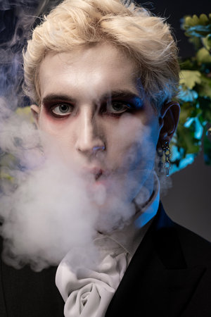 Young man in a stunning Halloween costume creates an enchanting atmosphere with fog and style.