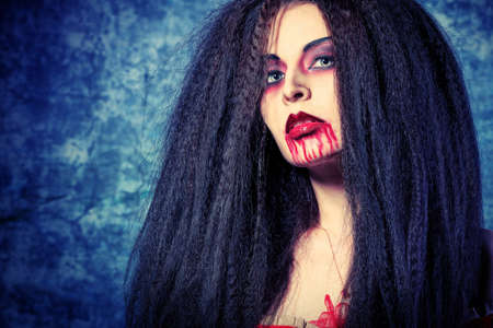 Close-up portrait of a bloodthirsty female vampire.