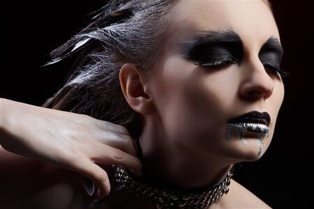 portrait of beautiful girl with bird of prey fantasy make-up pulling collar on her neck. silver paint flowing from lips