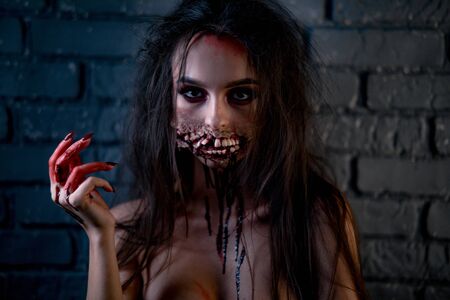 Woman in a carnival costume of bloody mutant or vampire stands with a lot of ugly teeth on the face. Halloween concept.