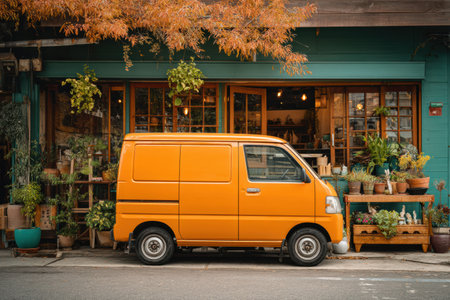 Delivery van awaits pickup outside a charming cafe, surrounded by lush plants and an inviting atmosphere during a bright day.