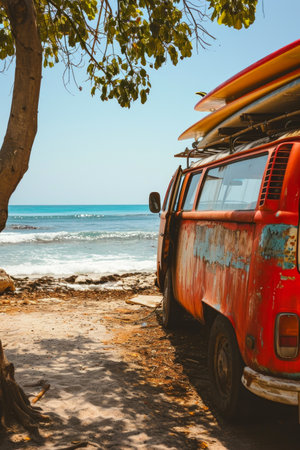 An orange vintage van is parked by the sea under a clear blue sky. The composition showcases a road next to the beach. The scene displays a colorful aesthetic with natural light and copy space. This image could be used for travel, adventure, or lifestyle themes.
