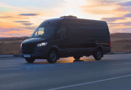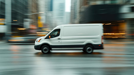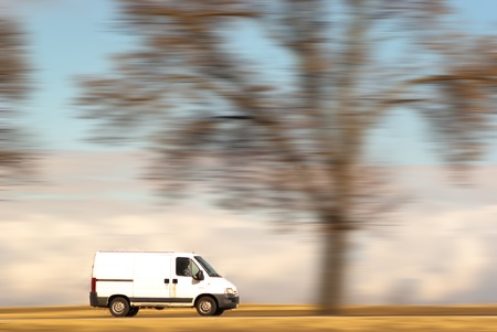 White commercial delivery van on the road with motion blur background. Shallow depth of field.