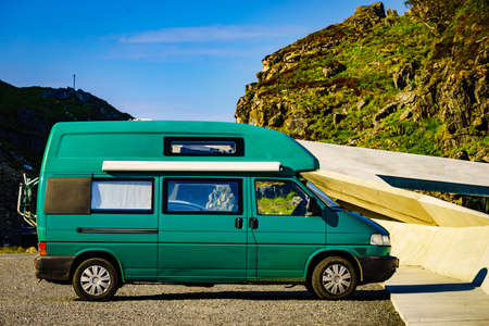 Camper van on rest stop location Bukkekjerka viewing point. Andoya island rocky coastline, Vesteralen archipelago, Norway.