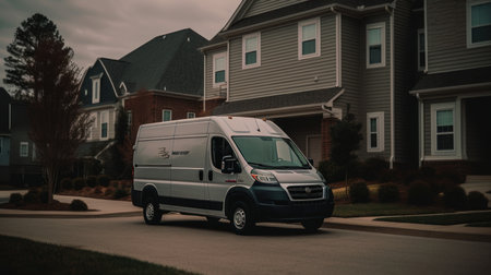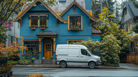 White Delivery Van Parked In Front Of Blue House On A Residential Street