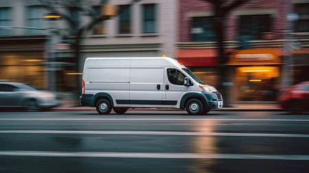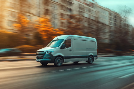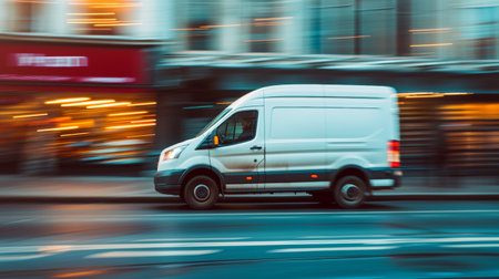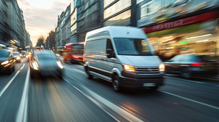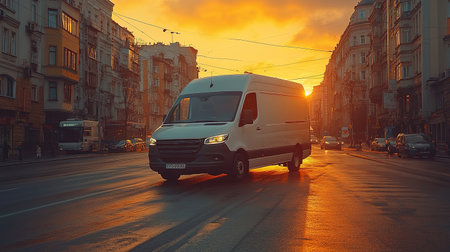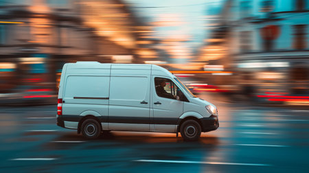 A white delivery van speeds down an urban road during sunset, creating a dynamic motion effect against a blurred city skyline. Ideal for transport themes.