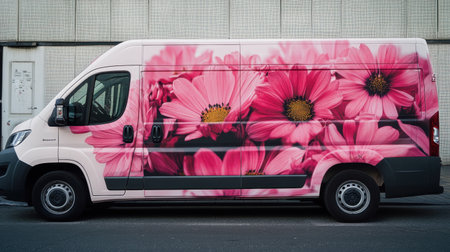 A striking van adorned with bright pink flowers, set against an urban backdrop. This vibrant image captures the essence of beauty and creativity in transportation.