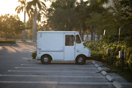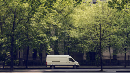 White van city street green trees summer urban transportation delivery vehicle sunlight peaceful
