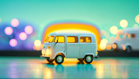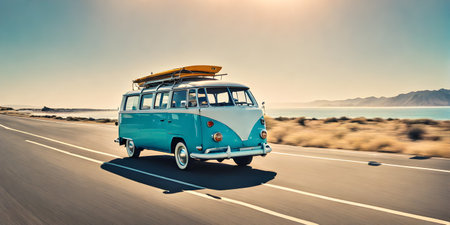 1960s California summer: vintage bus cruising coastal highway, pastel sunset backdrop