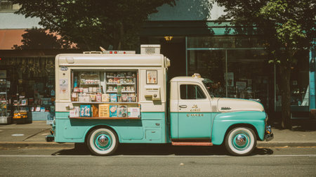 A charming vintage ice cream truck parked in a lively city street, offering colorful treats and evoking a sense of nostalgia and summer fun.