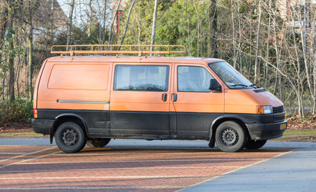 Old French Panel Van. Left side view of a vintage orange food truck.