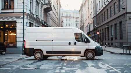 White delivery van parked on a city street. Urban logistics and transportation service.