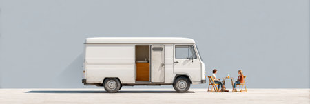 Nestled in a van with expansive windows, a serene workspace emerges, revealing the ocean at sunset. This tranquil space invites creativity and relaxation amidst nature's beauty.