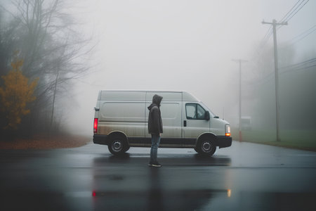 broadcast van during storm, with dramatic lightning flashes and raindrops visible on the window, created with generative ai