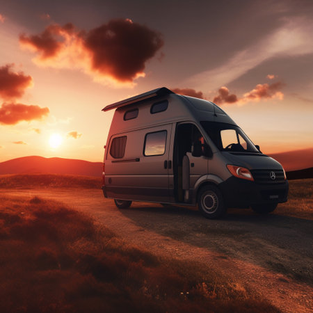 This beautiful image showcases a sleek and modern camper van parked on a quiet country road, with a stunning sunset visible in the background. The vans exterior is stylish and minimalistic, suggesting a focus on simplicity and functionality. Inside the van, a comfortable bed and a small kitchen are visible, providing everything one might need for a cozy and convenient road trip. Outside the van, a small telescope on a tripod is visible, suggesting a night spent stargazing under the clear and peaceful night sky.
