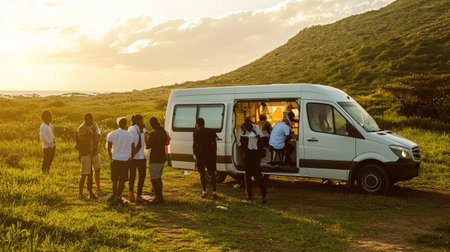 A diverse group of people enjoying a sunset gathering around a van in a picturesque outdoor setting. The scene captures a moment of connection and leisure amidst nature.